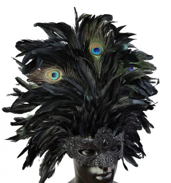 Black glitter mask trimmed in black brocade lace and black stone details along with large full feather headdress