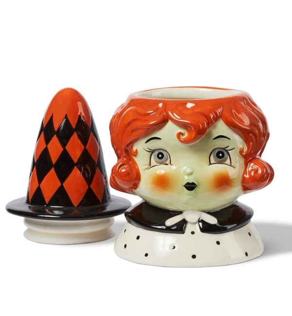 Get festive and witch everyone a happy Halloween with this Johanna Parker Witch Canister! Remove the witch’s hat to reveal the secrets hidden deep within. Display on your kitchen counter or add to your Halloween hutch for a touch of whimsical charm.