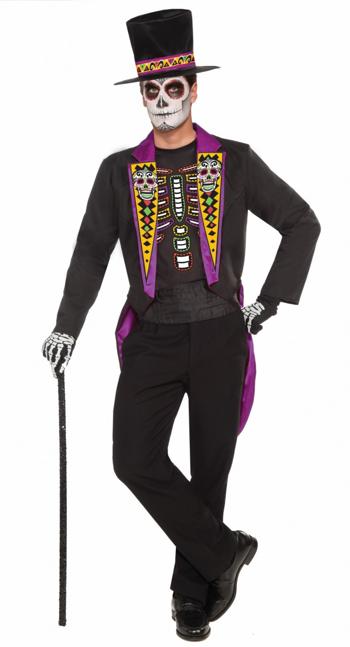 Celebrate Dia de los Muertos in style this year with this awesome Formal Suit for men. Costume includes Black tuxedo style jacket with tail and colorful sugar skull print lapels, colorful ribcage t-shirt and matching top hat.