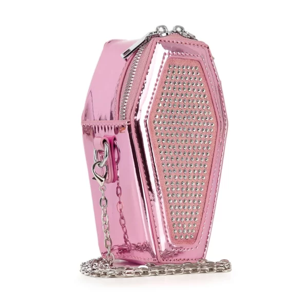 You will be spot on trend with this gothic inspired, sparkling coffin style shoulder bag. Tres Chic! 18.5L detachable chain strap. Faux leather with lined interior. Top zip closure. Silver toned hardware. Approximate Size: 3.5L x 6.5H x 2.5W