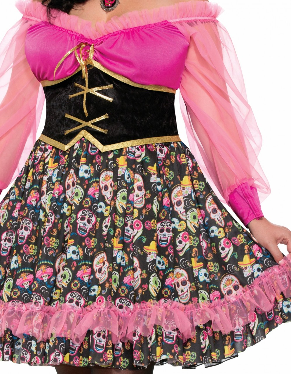 Women’s Plus Size Senorita Costume includes dress with sheer off the shoulder sleeves and velveteen top with attached multi colored sugar skull print skirt and a corset style belt with gold trim
