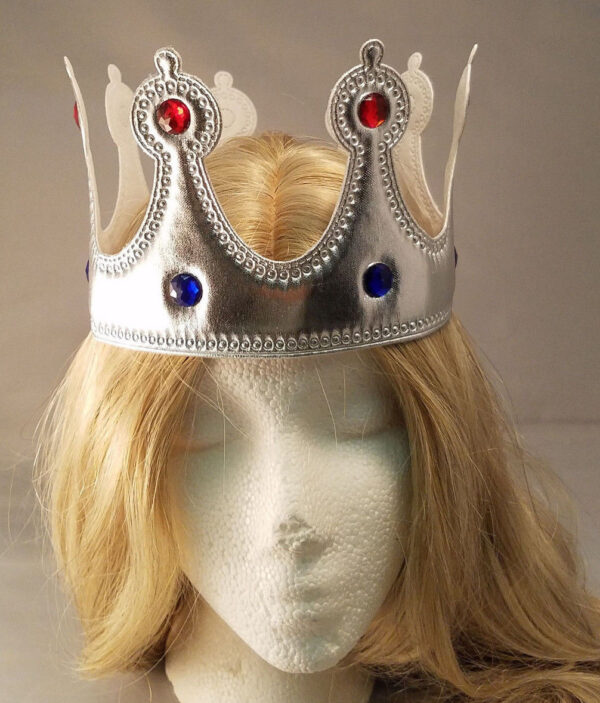 Enhance your Regal moment with our Silver Jeweled Crown. This metallic fabric crown is adorned with red and blue colored gems.