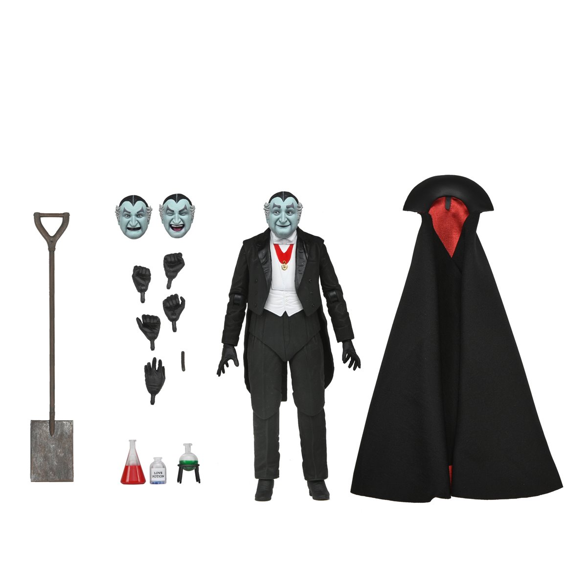 This collectible figure includes multiple interchangeable heads featuring the likeness of actor Al Lewis, as well as interchangeable hands, soft goods cape, several potions, and a shovel. Comes in collector-friendly window box packaging with opening front flap.