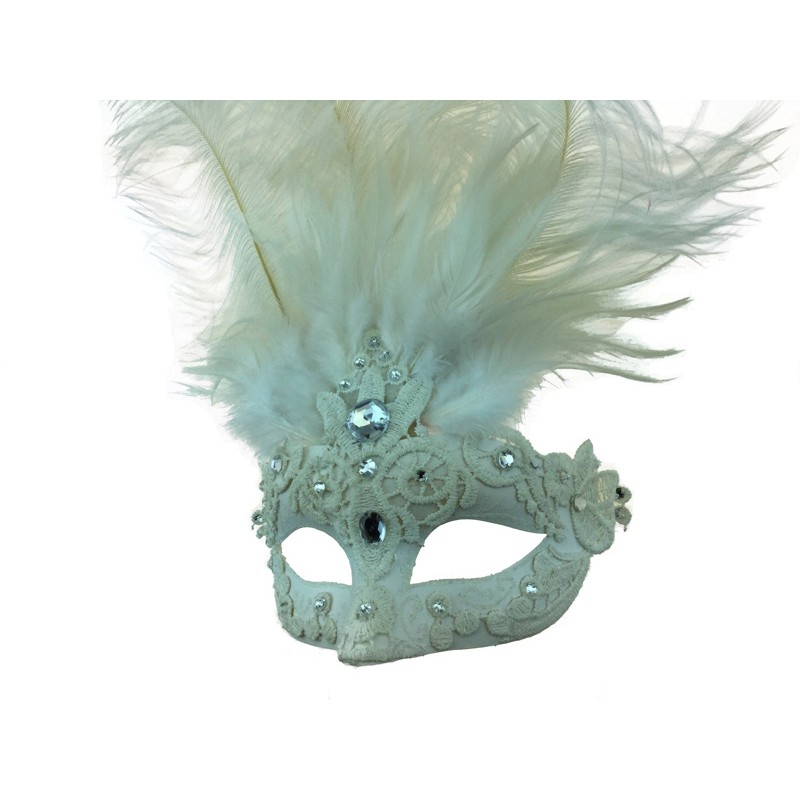 White mask trimmed in white brocade lace and clear stone details and featuring large beautiful front feathers