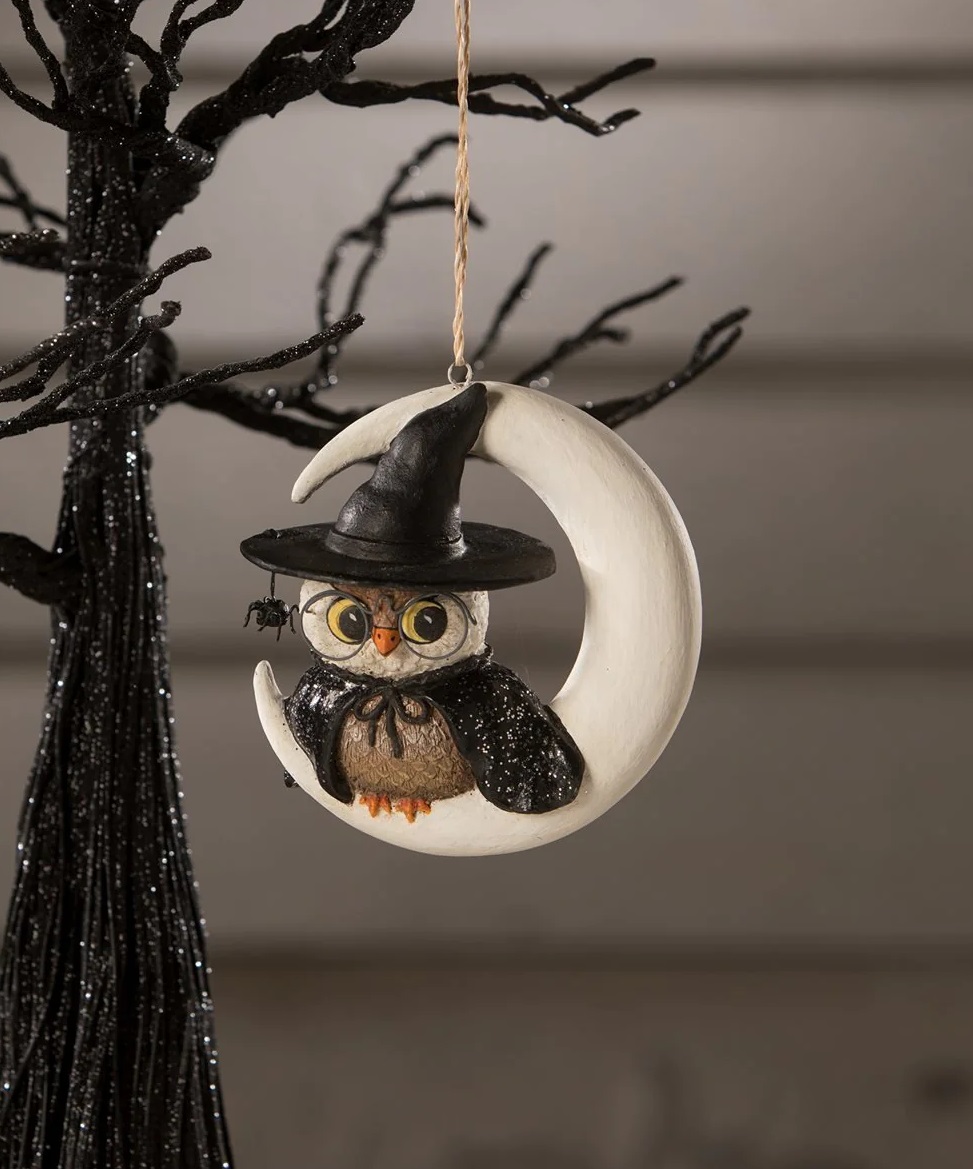 Behold the endearing Witch Owl On Moon Ornament, a captivating addition to your collection of magical Halloween treasures to hang on your tree or a mantel garland.